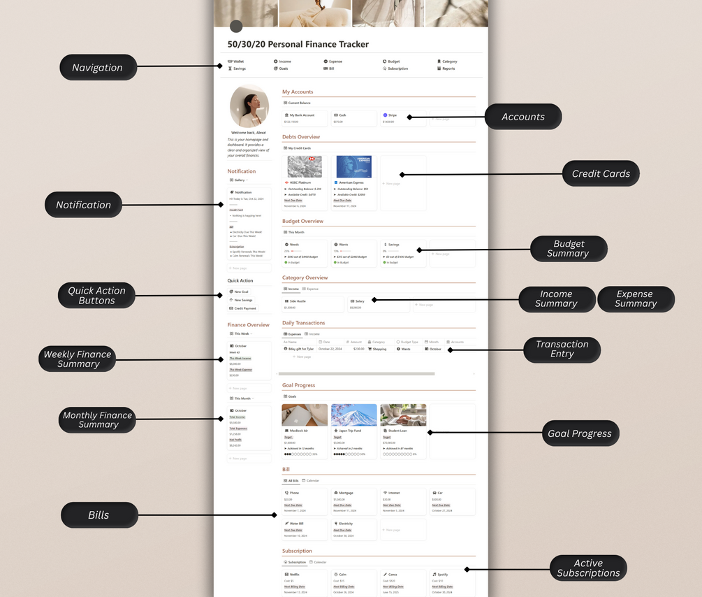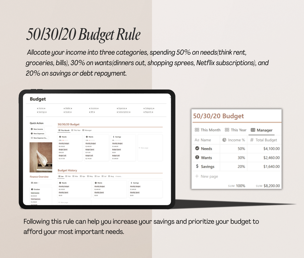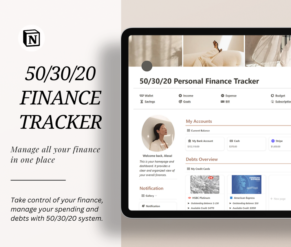 Aesthetic Notion 50/30/20 Personal Finance Tracker | Notion Template