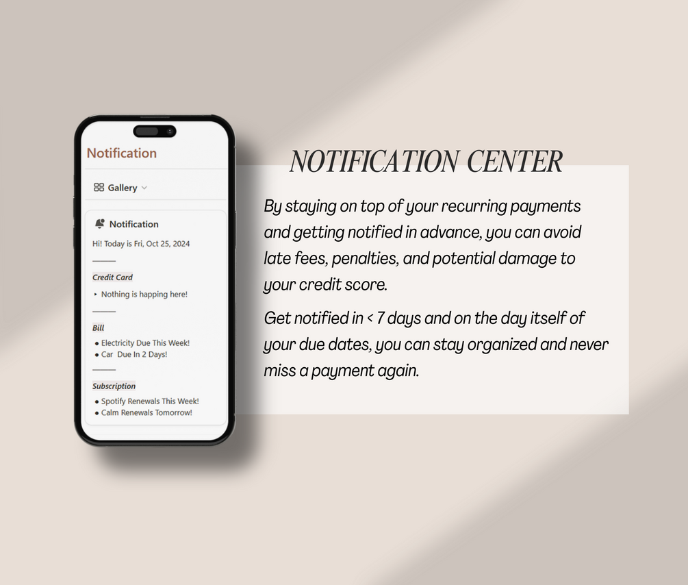 - Receive reminders for upcoming bills and track recurring costs.