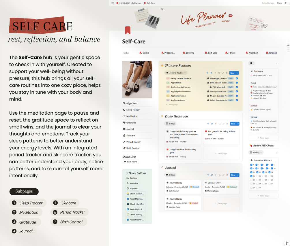 - Pages included - Sleep Tracker, Meditation, Gratitude, Journal, Skincare, Period Tracker, Birth Control