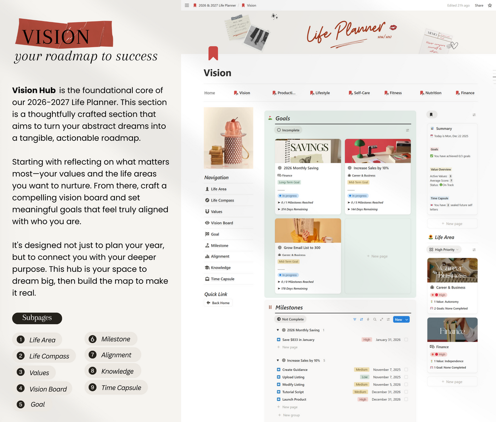 - Pages included - Life Area, Values, Life Compass, Vision Boards, Goals, Milestones, Alignment, Knowledge, Time Capsule