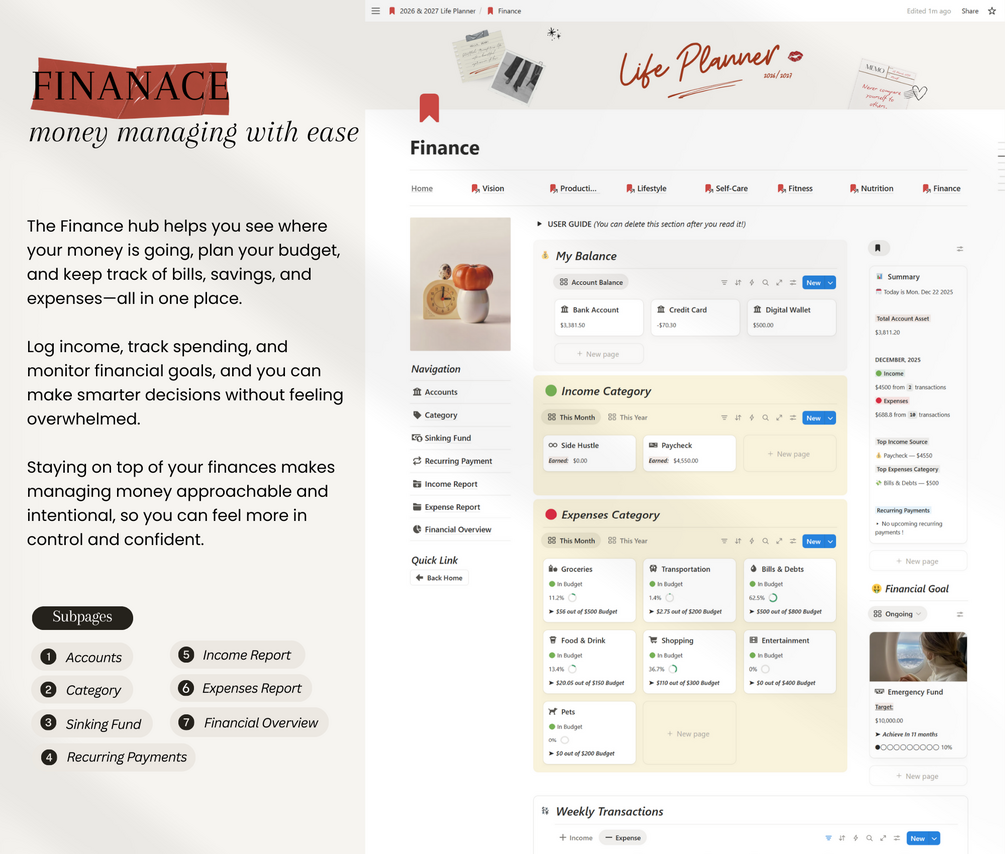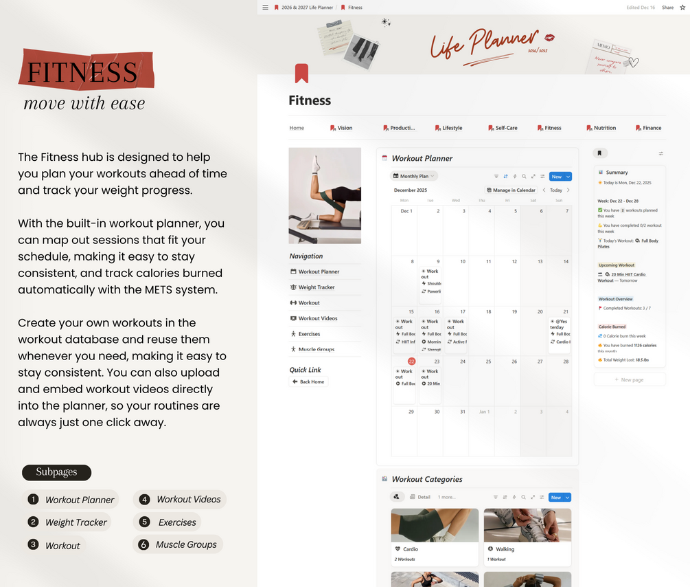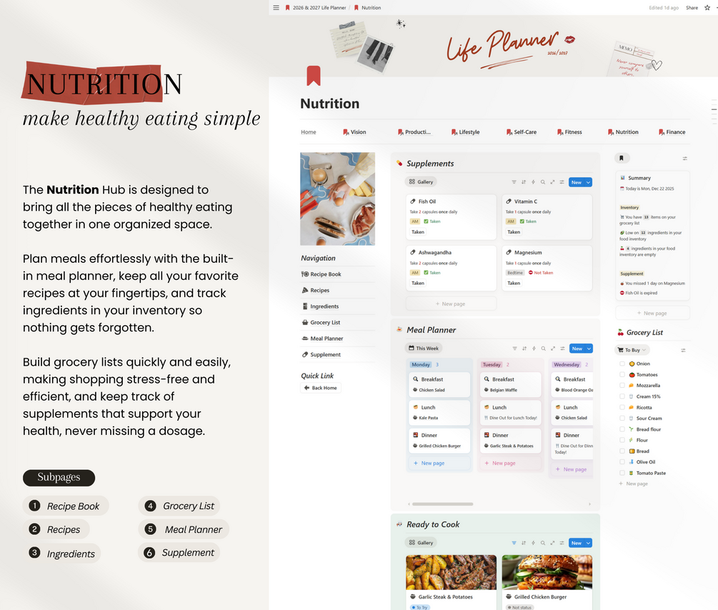 Built to be functional, aesthetic, and effortless, this template helps you plan your life with clarity, stay consistent—from daily schedules to reducing mental clutter while keeping life organized. Track habits, plan meals, manage your budget, prioritize self-care, and set meaningful goals—all while keeping it simple, structured, and visually pleasing.