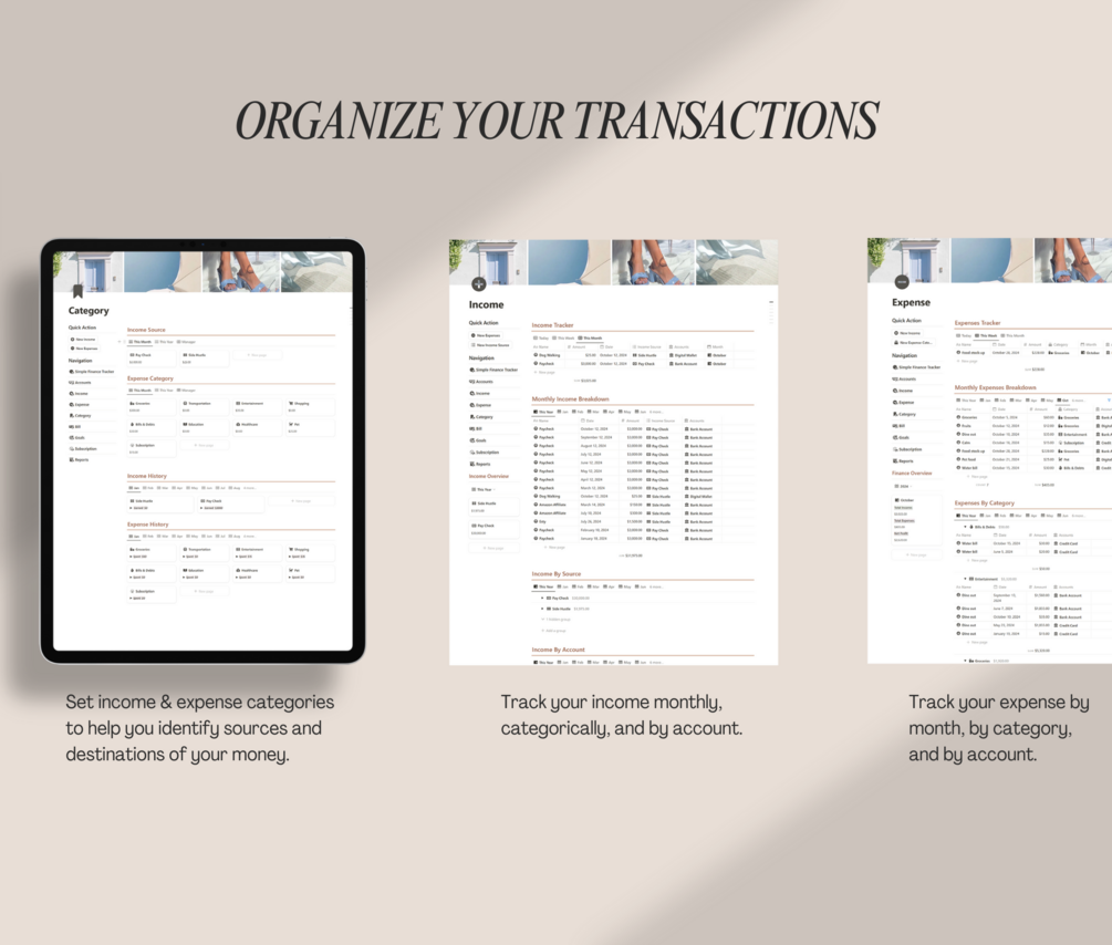 - Track income and expenses with daily, weekly, and monthly views. Categorize transactions for a detailed breakdown.