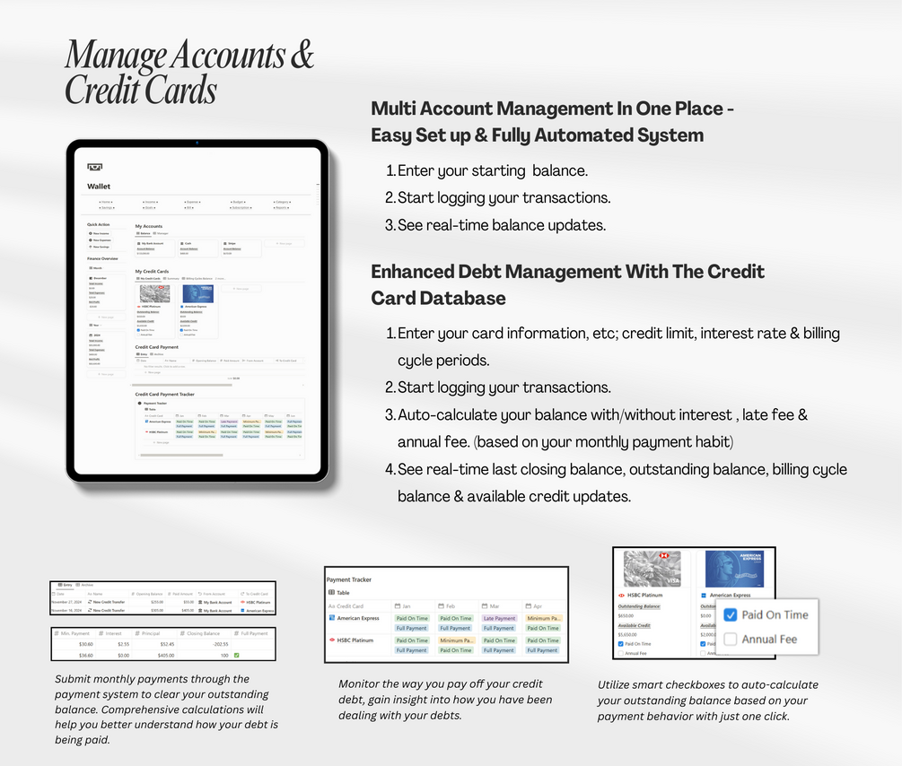 This tracker features a separate credit card database dedicated to credit debts. Its comprehensive calculation breaks down all the numbers associated with your credit card, from interest rates to annual fees. It calculates your balance based on the billing cycles that how banks calculate. It provides a better understanding of your credit card statements and assists you in better managing your credit debts.