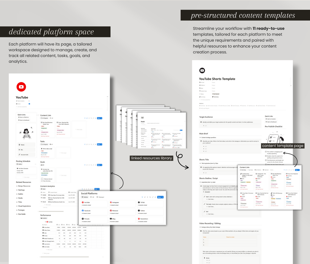 ✔ Platform-Specific Pages – Each social media channel has a dedicated page featuring a dynamic database for posts, schedules, tasks, goals, and analytics.