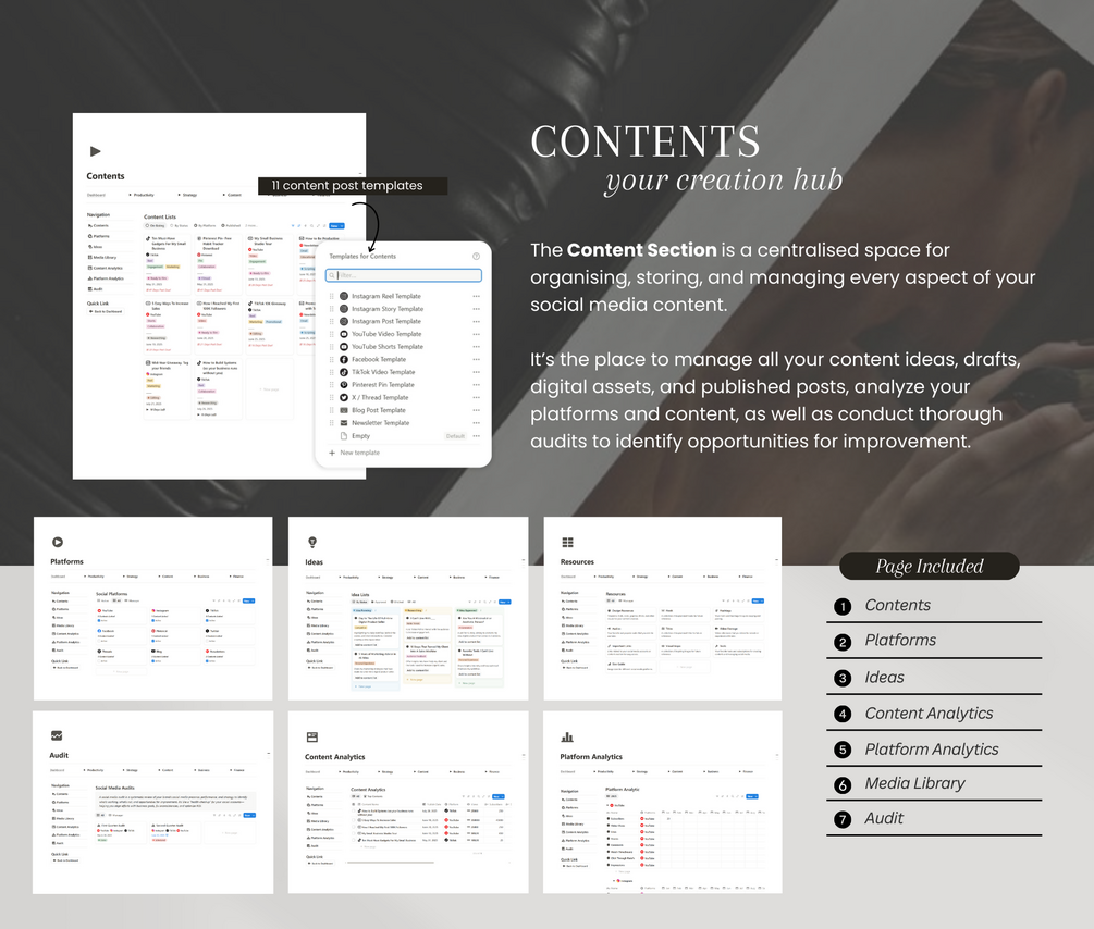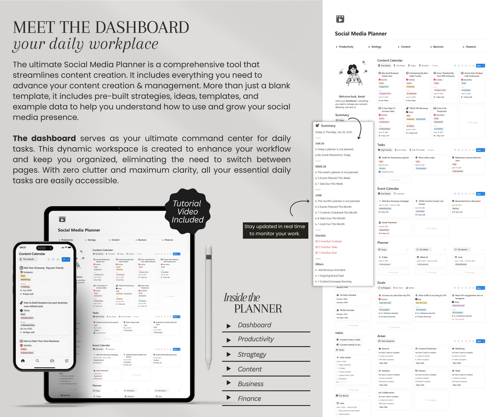 Whether you're a solopreneur, content creator, or social media manager, this template will help you stay consistent, save time, streamline your workflow, boost engagement, and post like a professional with this all-in-one planner.