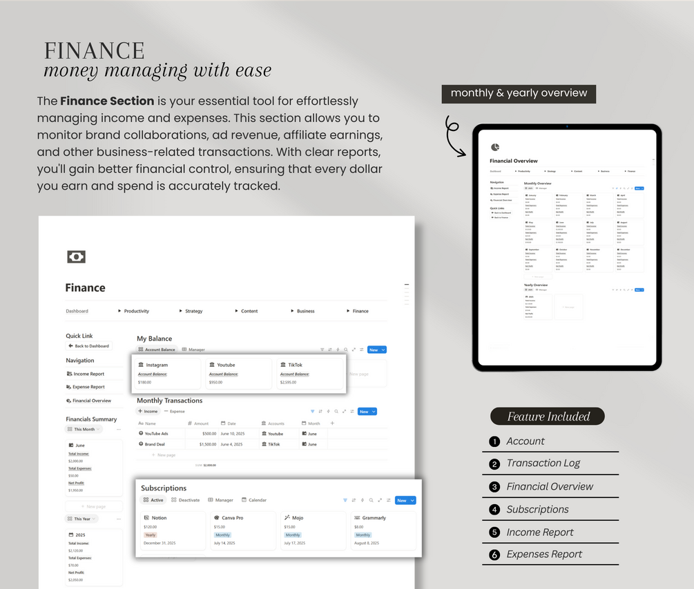 ❤ FINANCES - Accounts, Transactions Log, Subscriptions, Income Report, Expenses Report, Financial Overview.