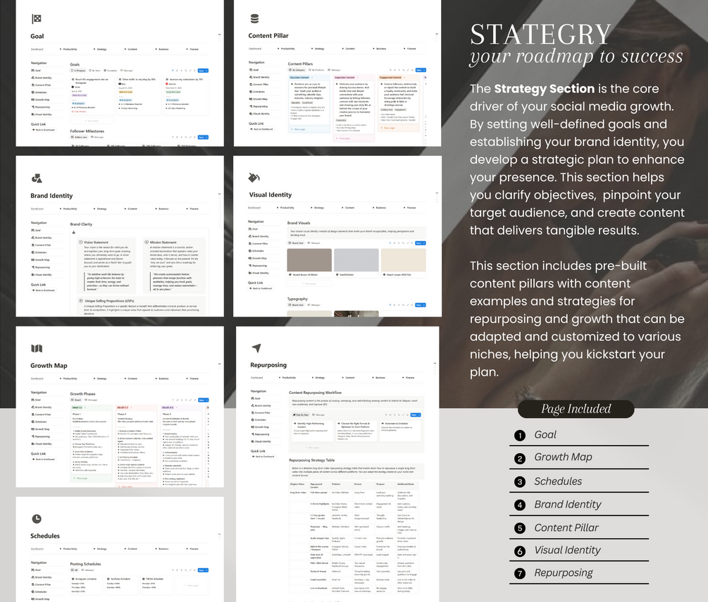 ❤ Strategy - Goal, Brand Identity, Content Pillar, Schedules, Growth Map, Repurposing, Visual Identity
