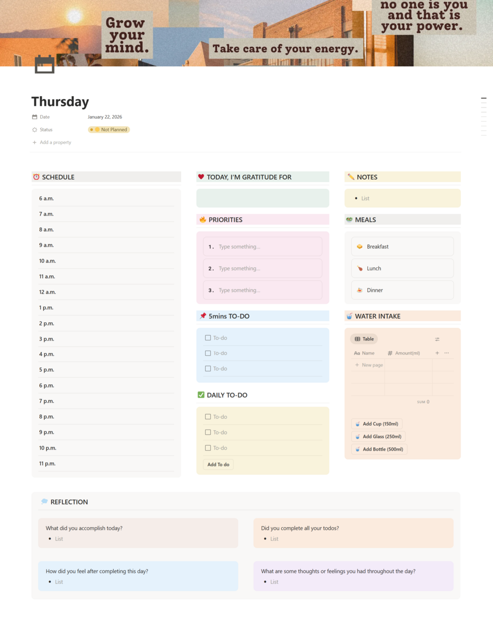 ✨ Includes: Smart time blocks • Top 3 priorities • 5mins to-do / Daily to-do sections • Meal & water tracking • Evening reflection prompts • Gratitude section • Notes