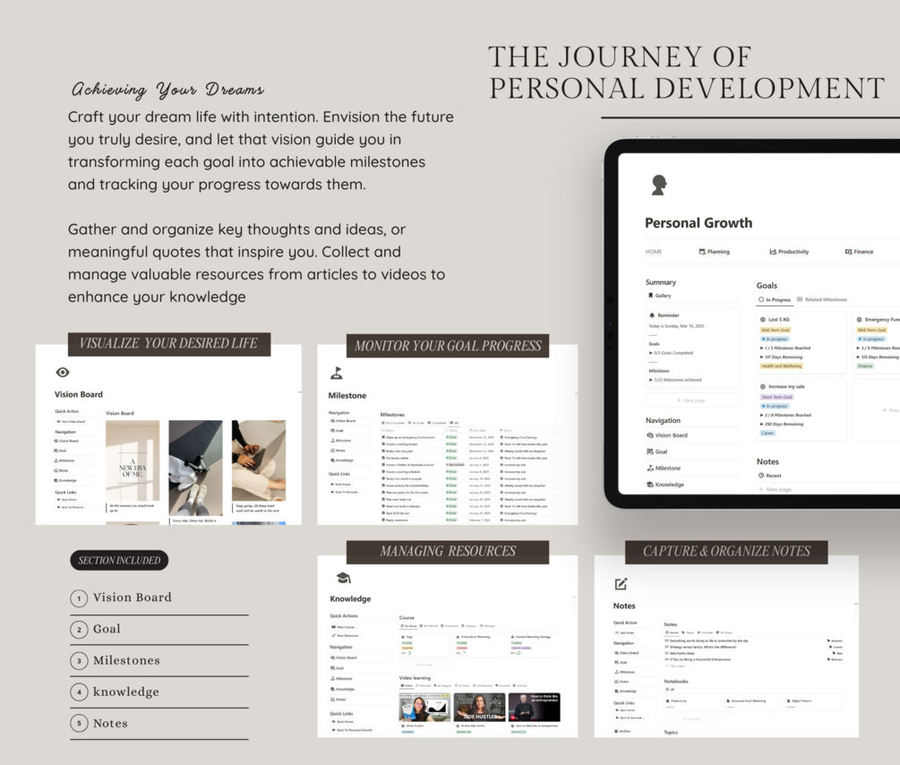❤ PERSONAL GROWTH - Vision Board, Goals, Milestones, Notes, Knowledge Resources.